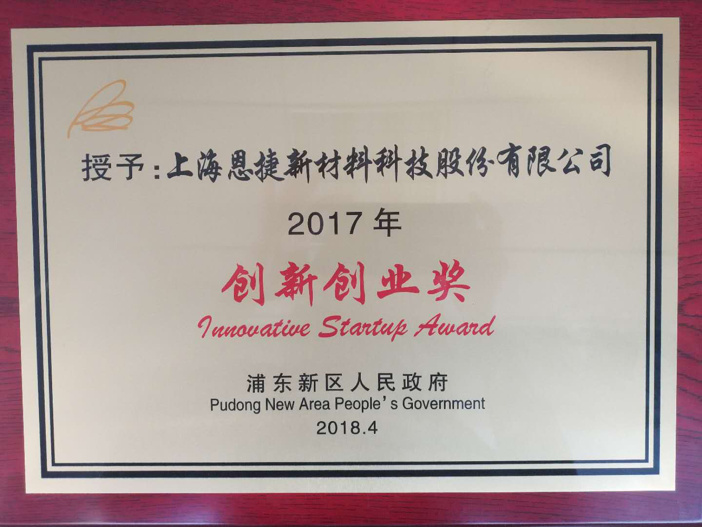 2018年4月,公司在上海浦东新区人民政府对经济突出孝顺企业表扬运动中,荣获2017年度“立异创业奖”。