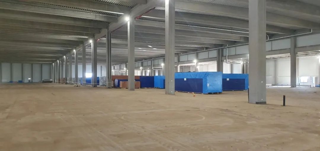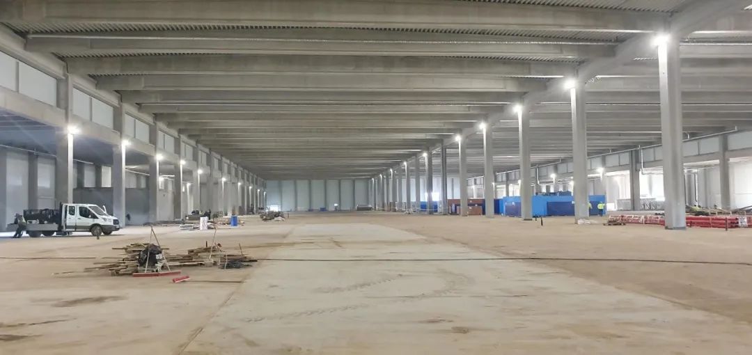 一期主体厂房内部,工业地板混凝土已经完成,雨水排放管线已装置完毕,正进入装备装置阶段。