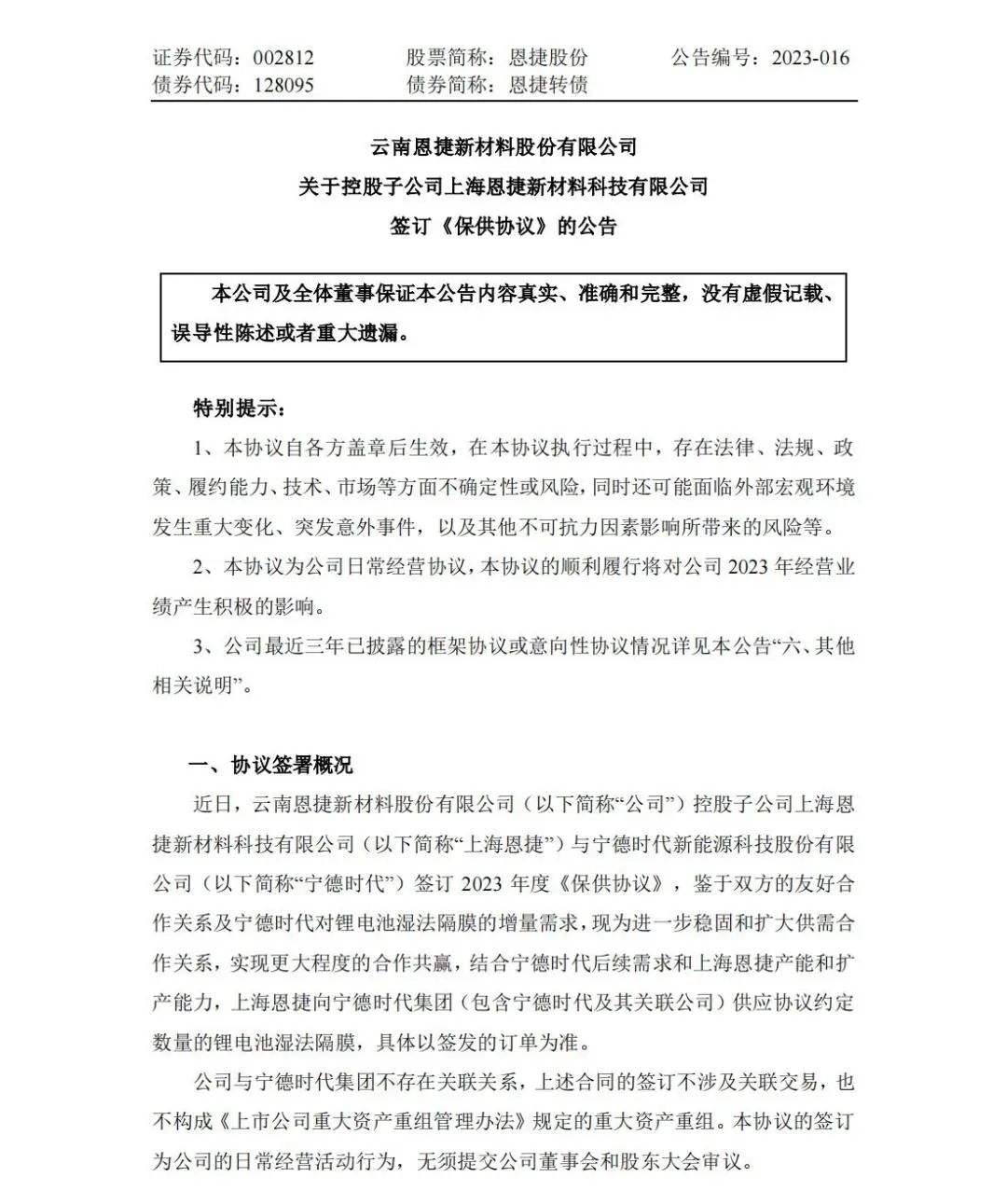 ÐÒéÔ¼¶¨£¬¼øÓÚË«·½µÄÓѺúÏ×÷¹ØÏµ¼°ÄþµÂʱ´ú¶Ôï®µç³ØÊª·¨¸ôĤµÄÔöÁ¿ÐèÇó£¬ÏÖΪ½øÒ»²½Îȹ̺ÍÀ©´ó¹©ÐèºÏ×÷¹ØÏµ£¬ÊµÏÖ¸üºéÁ÷ƽµÄºÏ×÷¹²Ó®£¬ÍŽáÄþµÂʱ´úºóÐøÐèÇóºÍÉϺ£Ð±¦gg´´ÔìÆæ¼£²úÄܺÍÀ©²úÄÜÁ¦£¬ÉϺ£Ð±¦gg´´ÔìÆæ¼£ÏòÄþµÂʱ´ú¼¯ÍÅ£¨°üÀ¨ÄþµÂʱ´ú¼°Æä¹ØÁª¹«Ë¾£©¹©Ó¦ÐÒéÔ¼¶¨ÃüÄ¿µÄï®µç³ØÊª·¨¸ôĤ£¬ÏêϸÒÔÇ©·¢µÄ¶©µ¥Îª×¼¡£