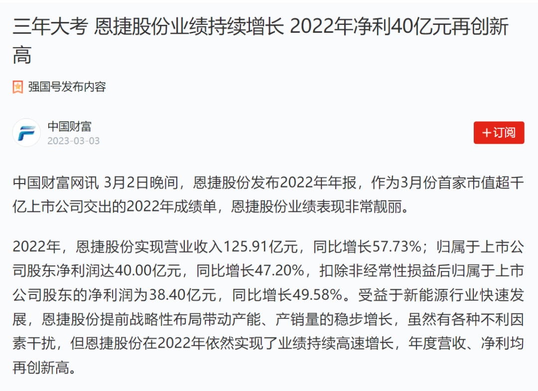作为市值超千亿上市公司交出的2022年效果单,新宝gg创造奇迹股份业绩体现很是靓丽。2022年,公司实现营业收入125.91亿元,同比增添57.73%;归属于上市公司股东的净利润达40.00亿元,同比增添47.20%,扣除非经常性损益后归属于上市公司股东的净利润为38.40亿元,同比增添49.58%。