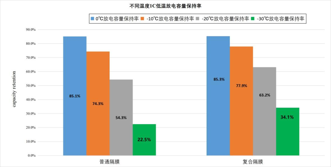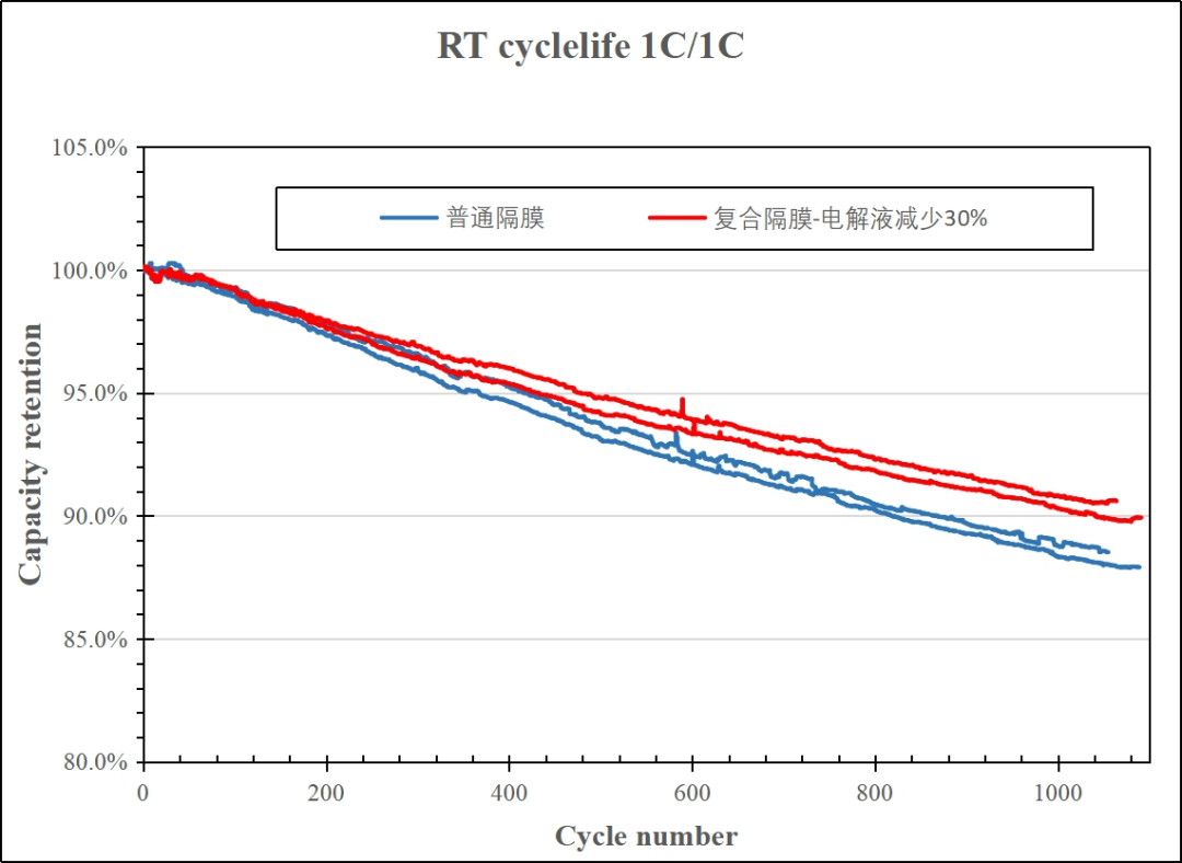 从性能上看,不但低温性能突出,电芯运用后电阻比通例隔膜显著降低以及在1C/1C充放电倍率下循环1000次的实验中发明,使用该复合膜的电芯电解液保有量与通例隔膜相比同比镌汰30%的情形下仍然可以坚持较高的循环容量坚持率。