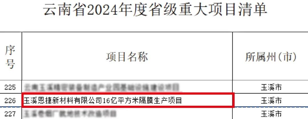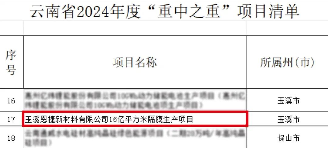 新宝gg创造奇迹股份旗下玉溪新宝gg创造奇迹16亿平方米隔膜生产项目被云南省生长和刷新委员会列入“云南省2024年度省级重大项目清单”和“云南省2024年度‘重中之重’项目清单”。