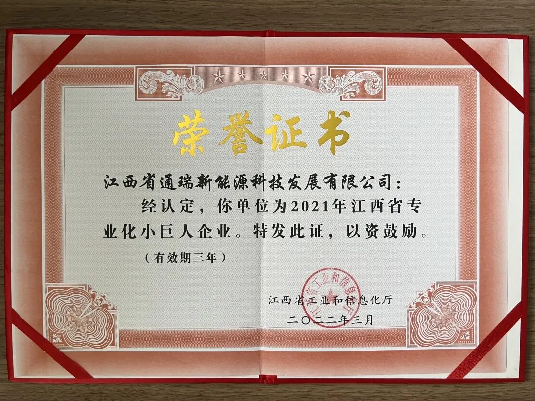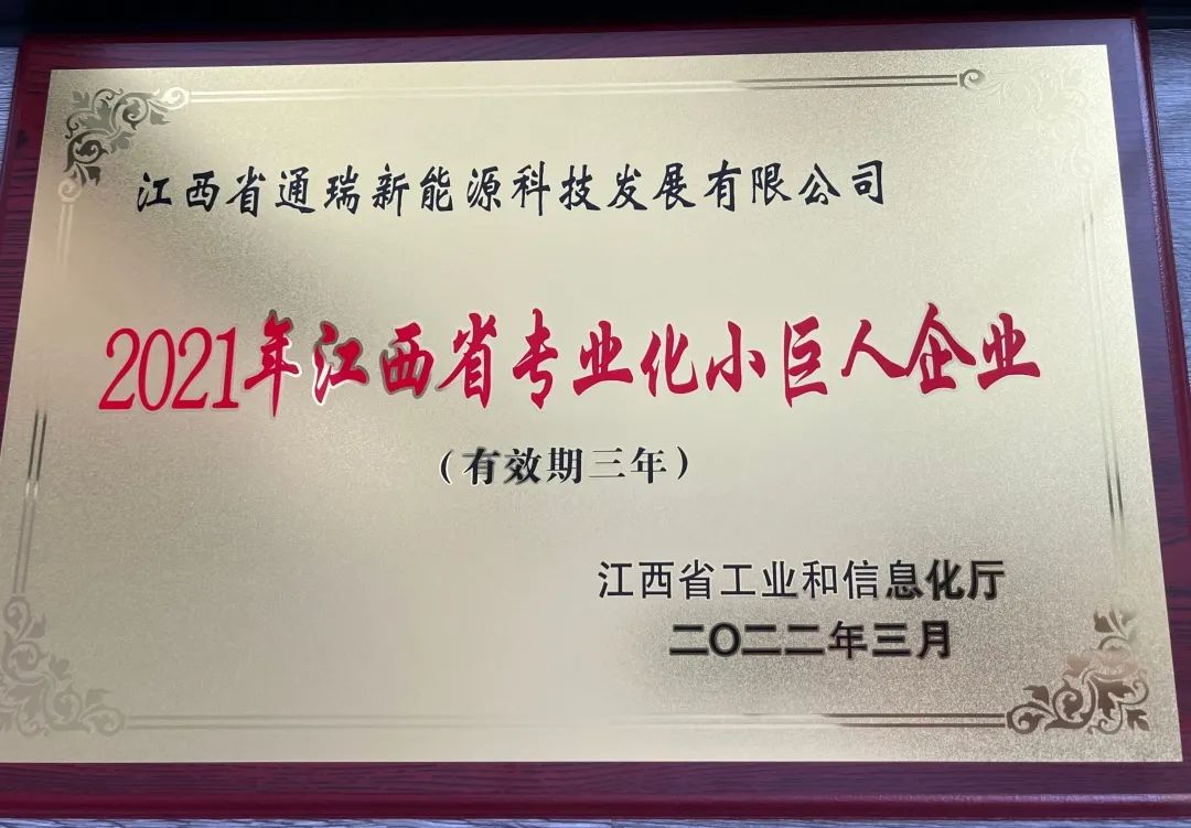 今年3月,江西省工业和信息化厅宣布了“2021年江西省专业化小巨人”企业名单,江西省通瑞新能源科技生长有限公司荣获省级“专业化小巨人”称呼。