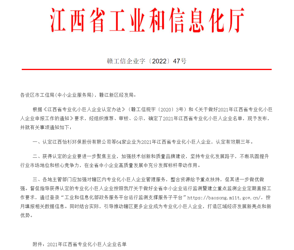 克日,江西通瑞获得了由江西省工业和信息化厅揭晓的“2021年江西省专业化小巨人企业”声誉证书。