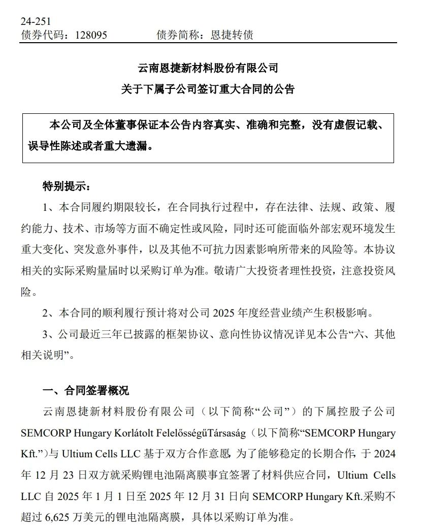 12月23日,新宝gg创造奇迹股份披露控股子公司匈牙利新宝gg创造奇迹与美国Ultium Cells LLC基于双方合作意愿,Ultium Cells LLC自2025年1月1日至2025年12月31日向匈牙利新宝gg创造奇迹采购不凌驾6,625万美元的锂电池隔膜,详细以采购订单为准。
