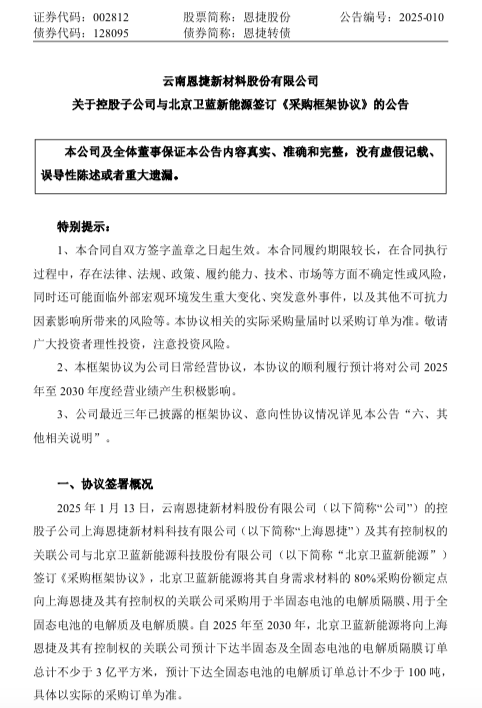 自2025年至2030年,北京卫蓝新能源将向上海新宝gg创造奇迹及其有控制权的关联公司预计下达半固态及全固态电池的电解质隔膜订单总计不少于3亿平方米,预计下达全固态电池的电解质订单总计不少于100吨,详细以现实的采购订单为准。